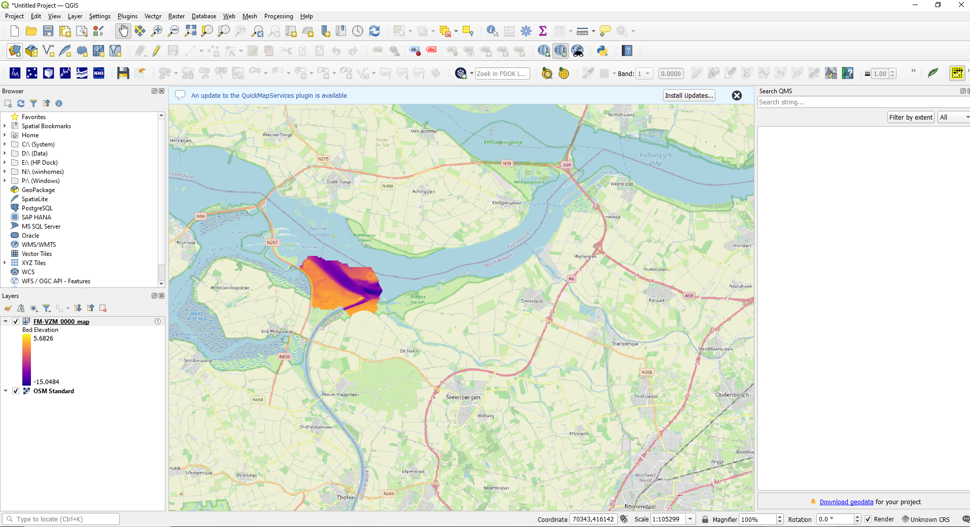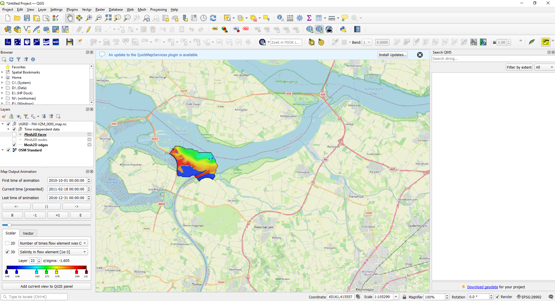 QGIS can handle 2D Mesh data directly. See the QGIS 3.28 documentation here. QGIS does however not recognize our newly created time axes (e.g. time_year, time_month after using the D-Eco Impact "time_aggregation_rule").