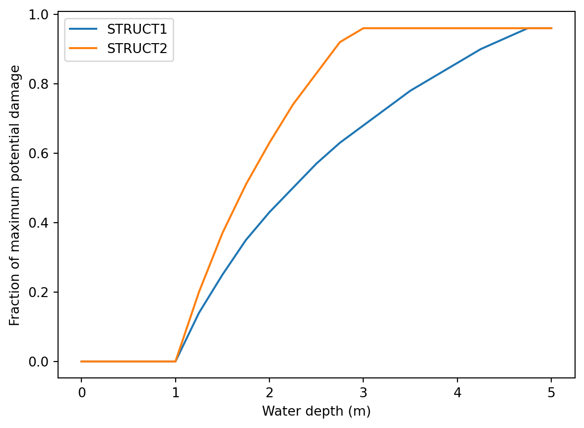 Water depths may be negative for assets that incur damage below the ground floor height, and the user is free to choose any water depth increments in the CSV file. The damage functions can have any name. Multiple damage-functions can be described in the vulnerability curves CSV file by simply adding consecutive columns next to one another.