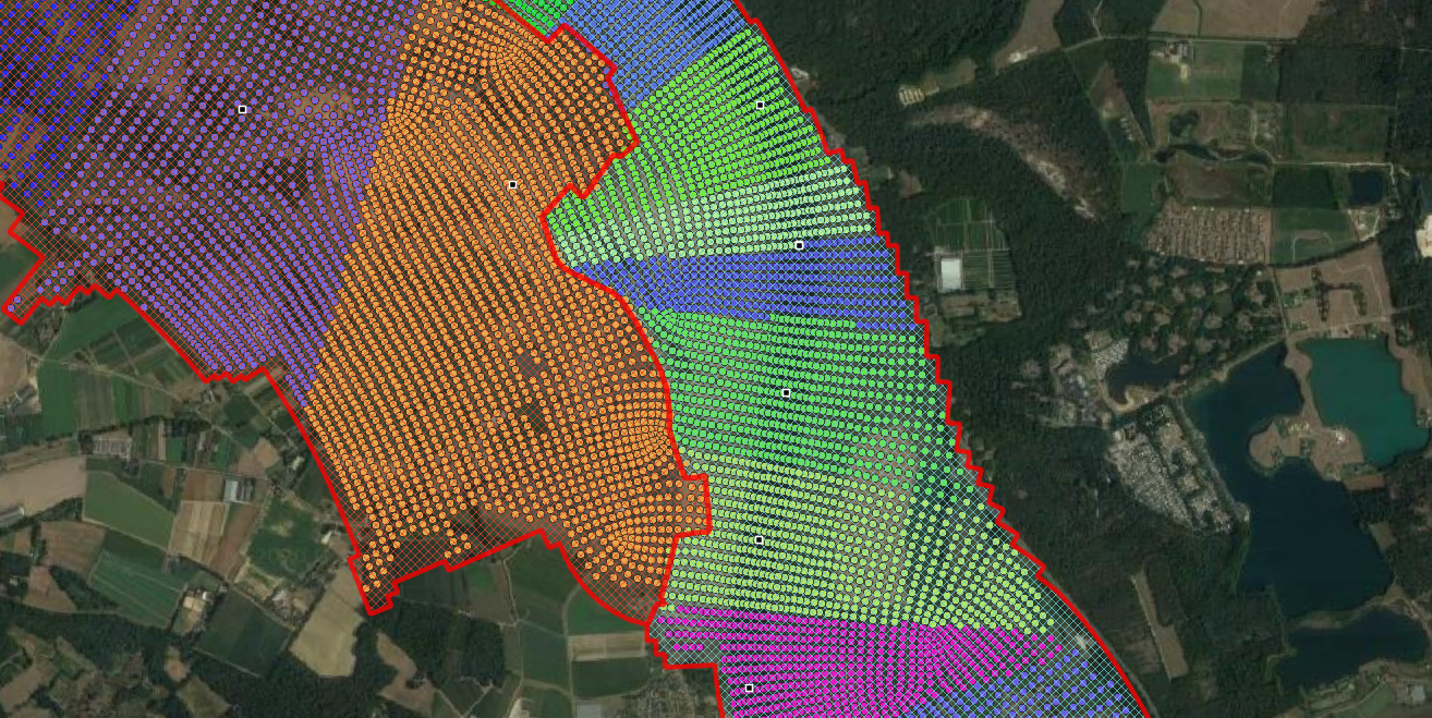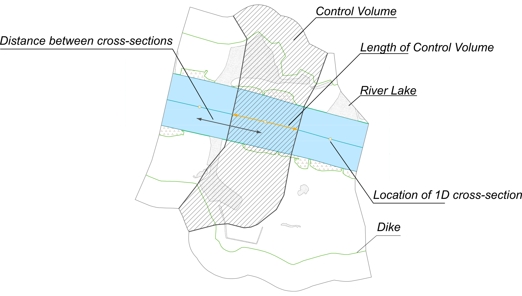 A control volume of a cross-section is the geographical part of the 2D model that is associated with that cross-section. Contol volumes are assigned by k-Nearest Neighbour classification.