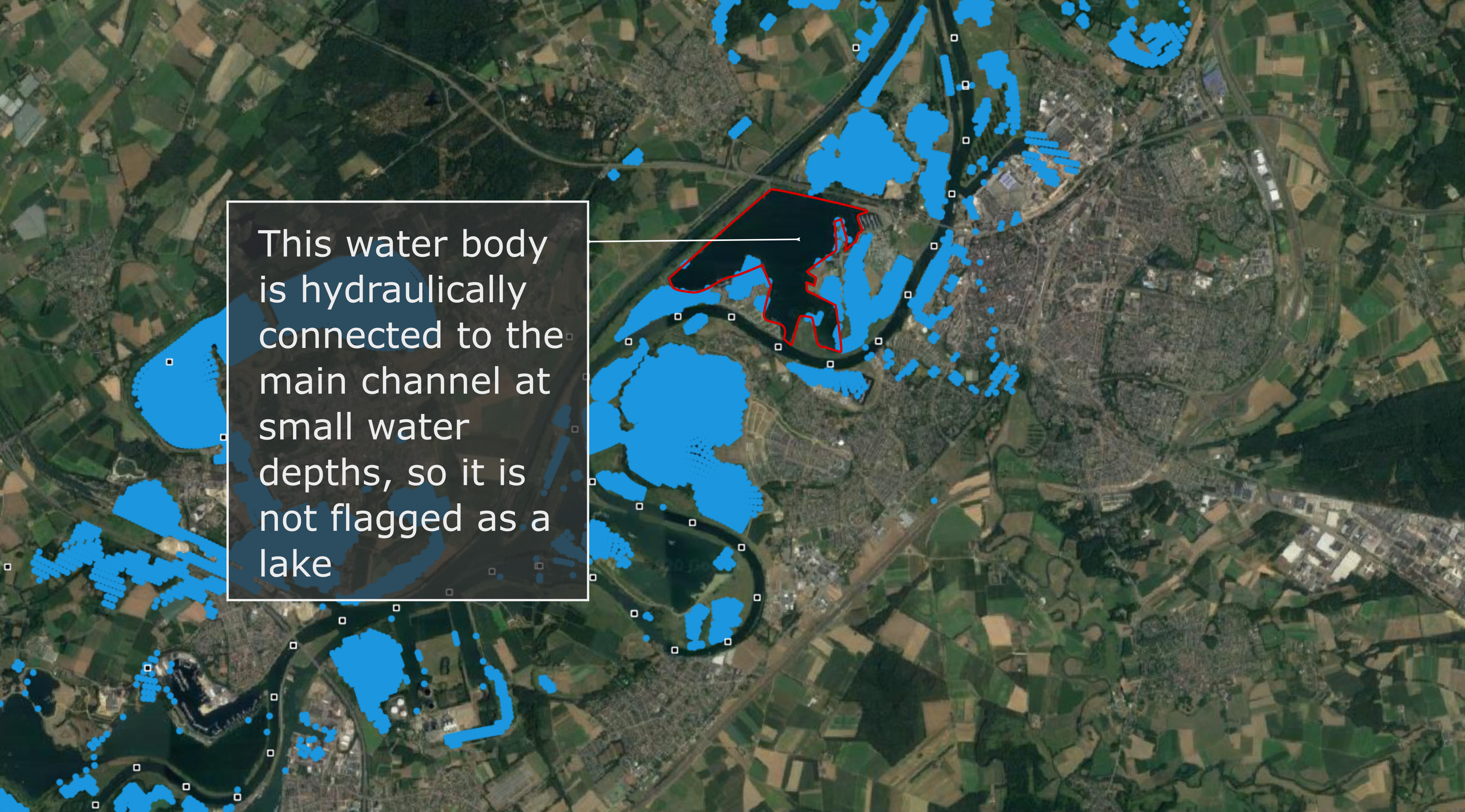 Lakes are water bodies that are not hydraulically connected to the main channel in the first few timesteps of the 2D model computation. They do not contribute to the volume present in the control volume until they connect with the rest of the river and will not feature in the water level independent computation. Water bodies that are connected to the main channel in the first few timesteps do count as volume. However, as these likely do not contribute to conveyance, they will be flagged as 'storage' instead.