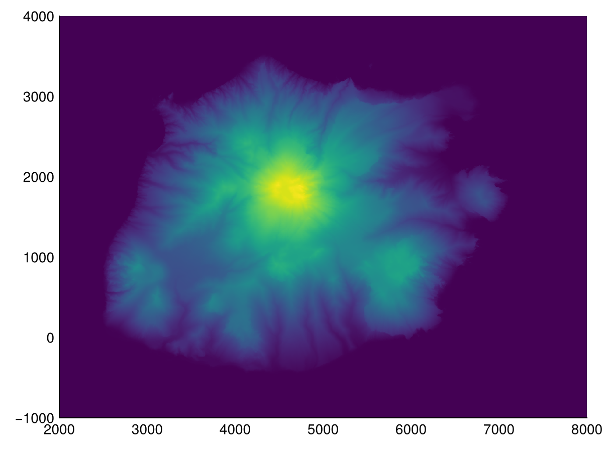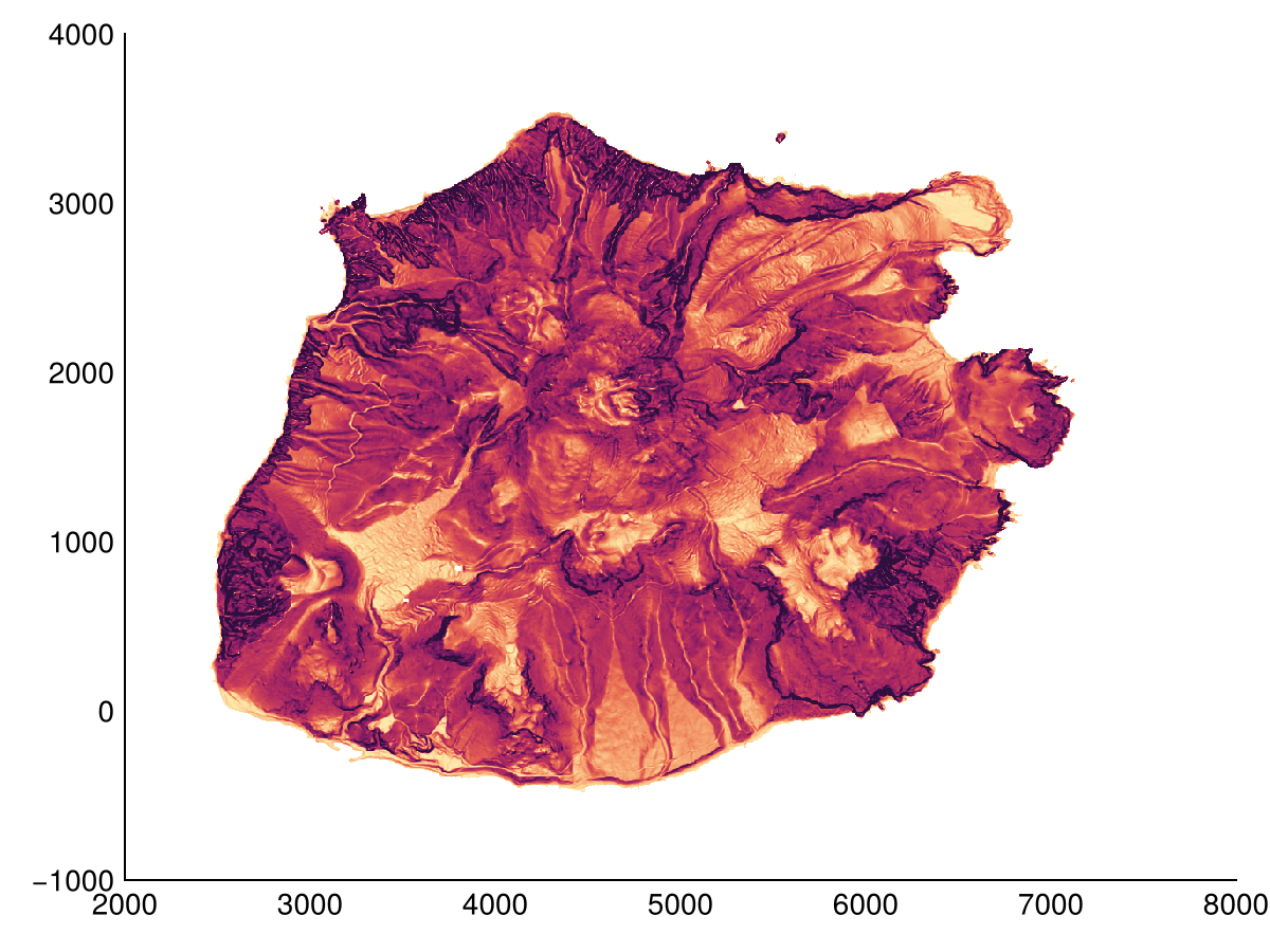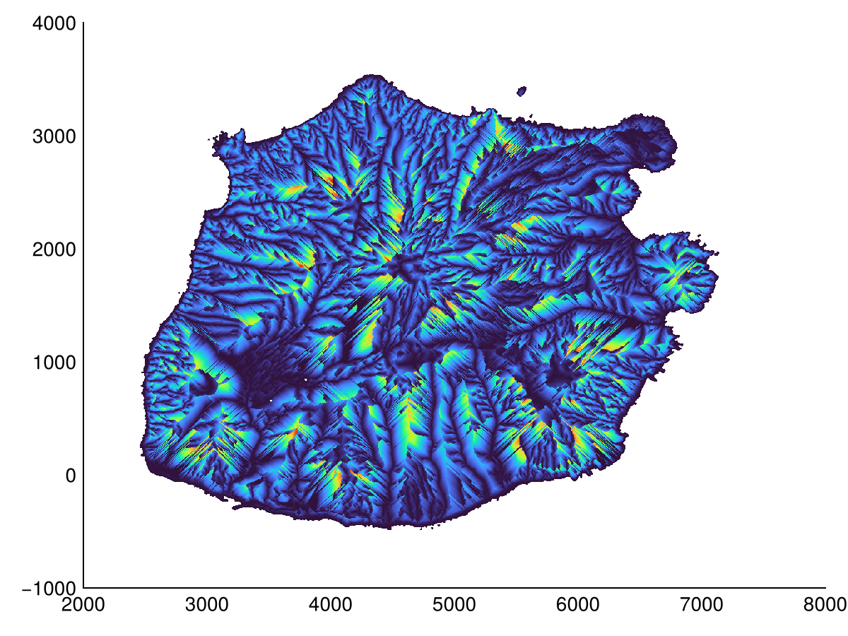 Hydrological operations are used to analyze the flow of water on the terrain. We provide filldepressions to fill depressions, depression_depth to calculate the depth of each depression (difference between filled dem and dem) and depression_volume that sums all depression depths. The major depression in the example is the caldera of the dormant volcano (Mount Scenery).