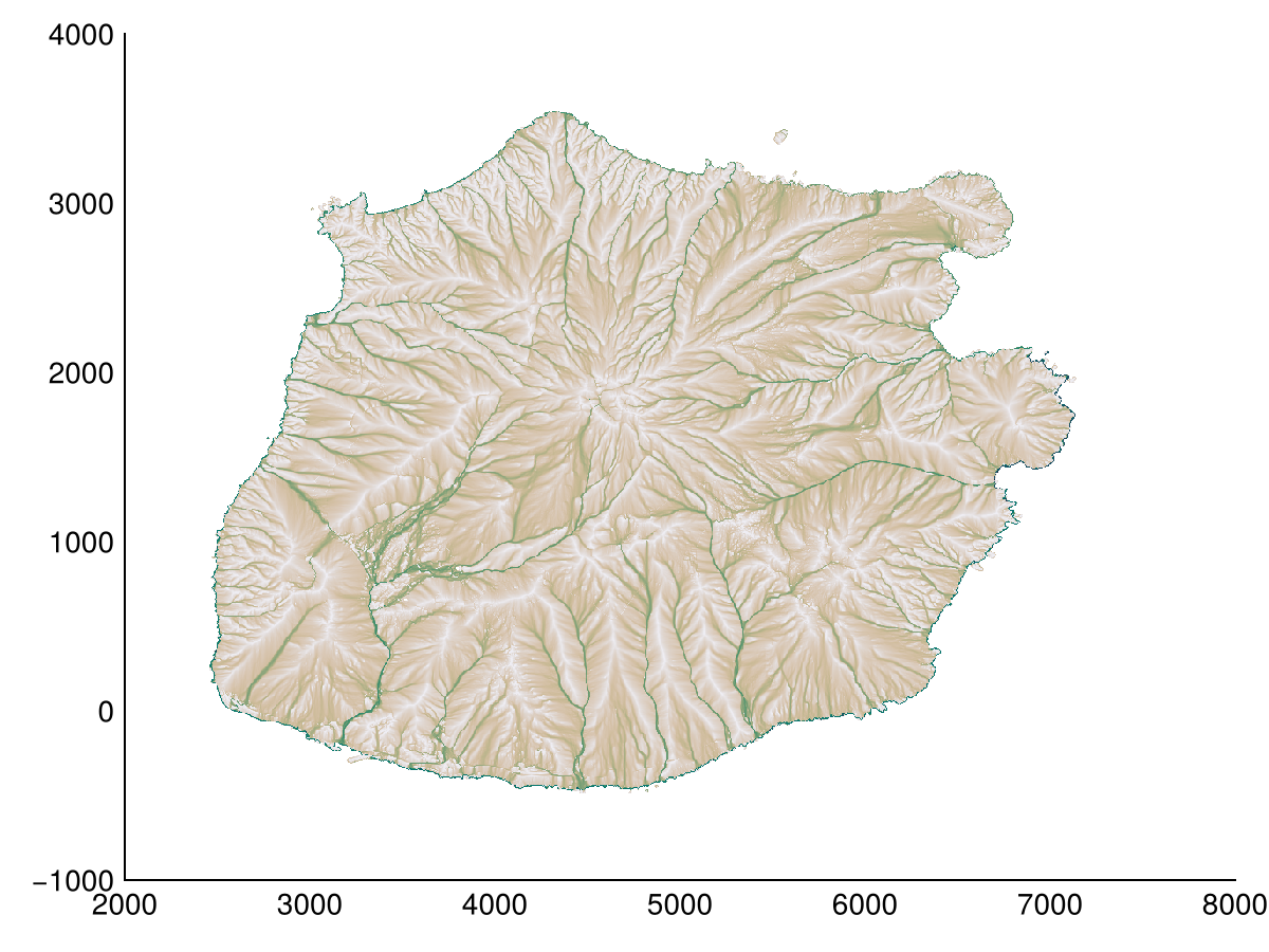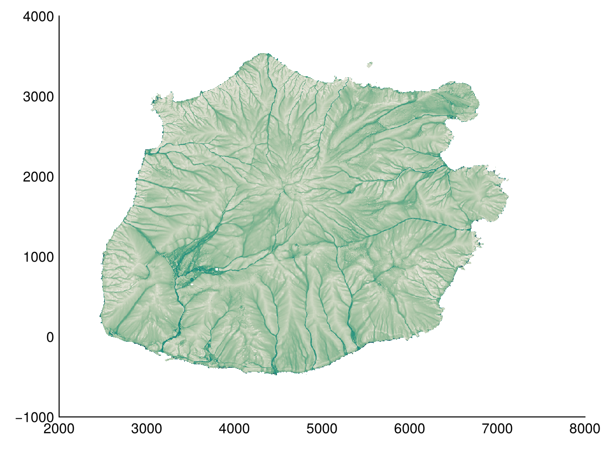 acc, ldd = flowaccumulation(dtm; method=FD8(2))