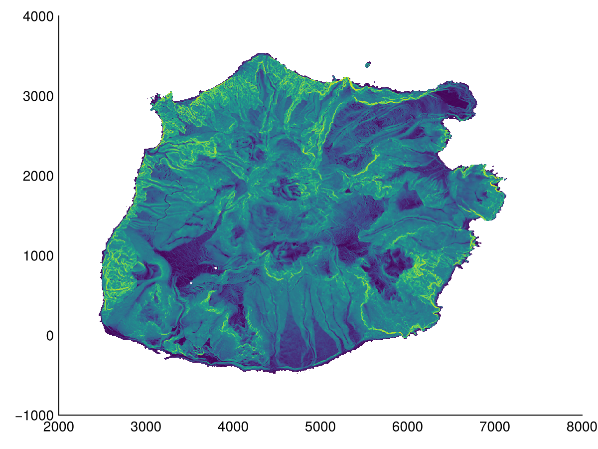 @info Geomorphometry.cellsize(ndem) # reversed y spacing┌ Error: Unknown CRS type, please report this issue for the given crs/file