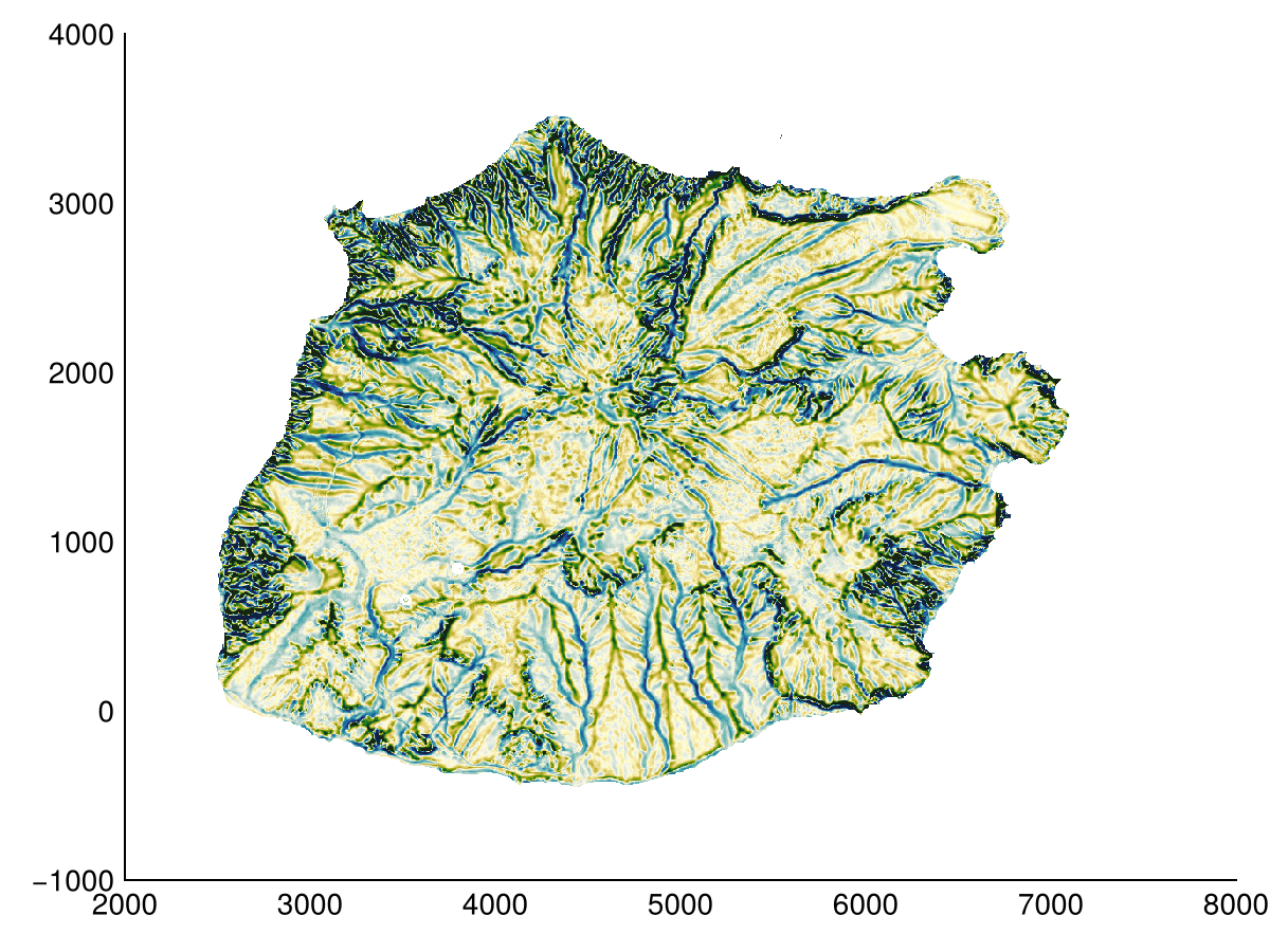 Hydrological operations are used to analyze the flow of water on the terrain. We provide filldepressions to fill depressions, depression_depth to calculate the depth of each depression (difference between filled dem and dem) and depression_volume that sums all depression depths. The major depression in the example is the caldera of the dormant volcano (Mount Scenery).