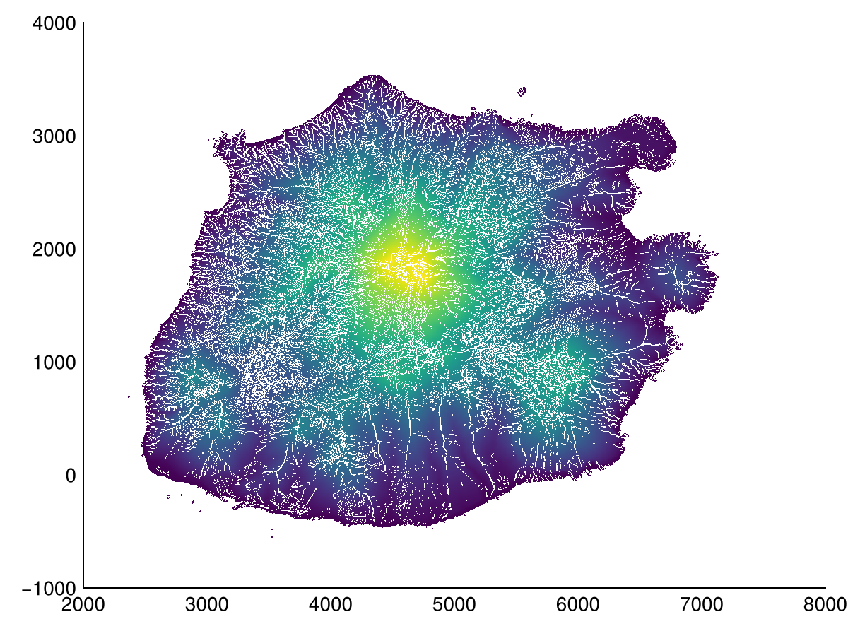 heatmap(spread(dtm .> 850, 0, slope(dtm).^2), colormap=:dense)